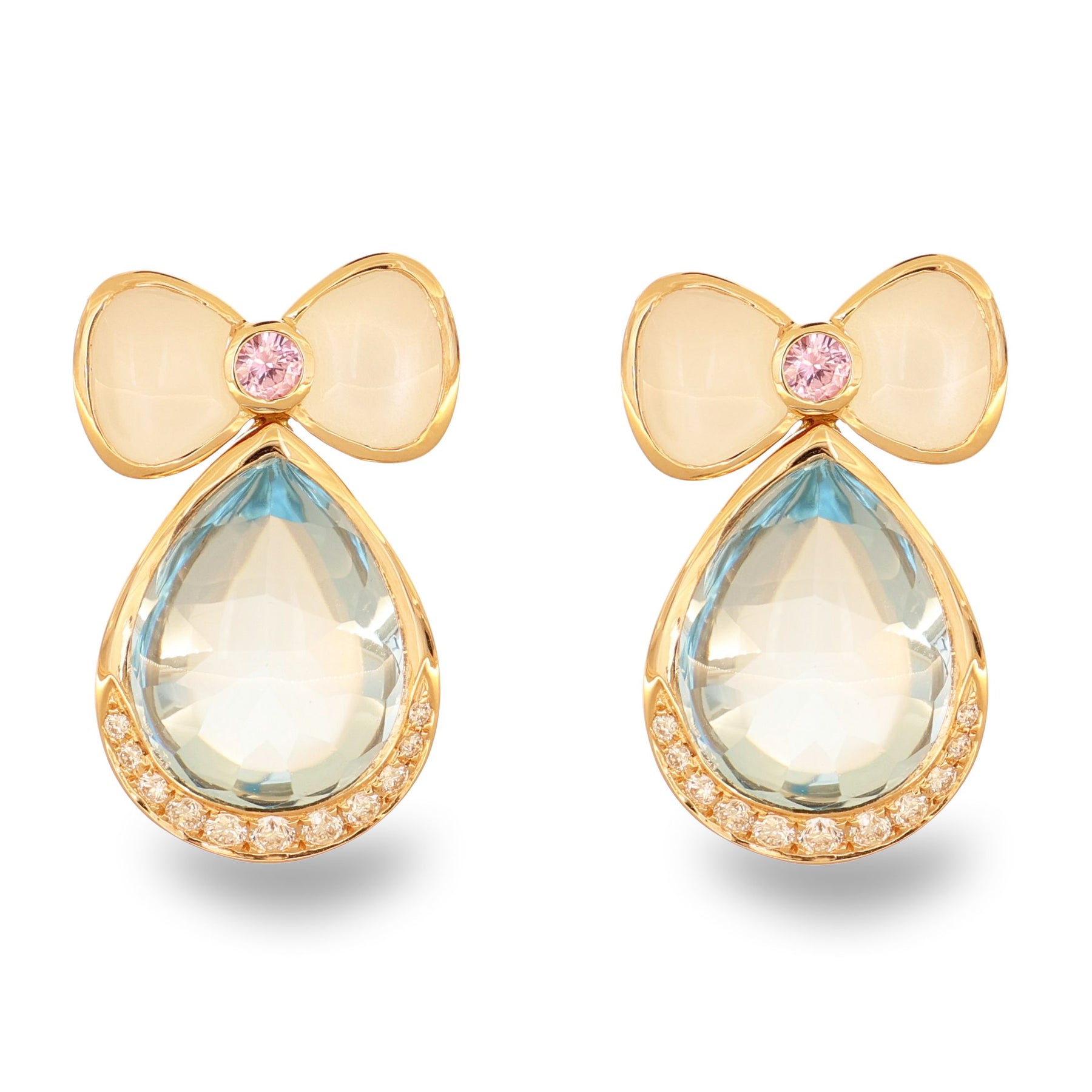 Diese Ohrstecker sind ein poetisches Zusammenspiel aus sanften Farben, edlen Materialien und femininer Anmut. In zart geschwungenen Roségold-Fassungen vereinen sich mondlichtfarbene Cabochon-Mondsteine mit pastellblauen Topasen im Tropfenschliff, die durch feine Brillanten umrahmt werden. Im Zentrum der Schleifenform funkeln rosafarbene Saphire als verspielter Akzent. Dieses Design ist eine Hommage an zarte Eleganz – ideal für besondere Momente oder als stilvolles Highlight im Alltag.