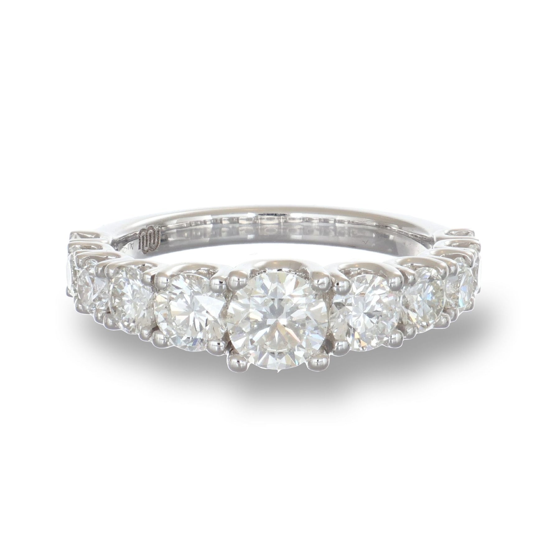 Ein Symbol für ewige Eleganz: Dieser edle Ring aus 750/- Weißgold verzaubert mit einem prachtvollen Mittelstein – ein Diamant im Brillantschliff. Umrahmt wird er von zehn weiteren Brillanten, die harmonisch auf der Ringschiene arrangiert sind und das Licht in alle Richtungen reflektieren.
