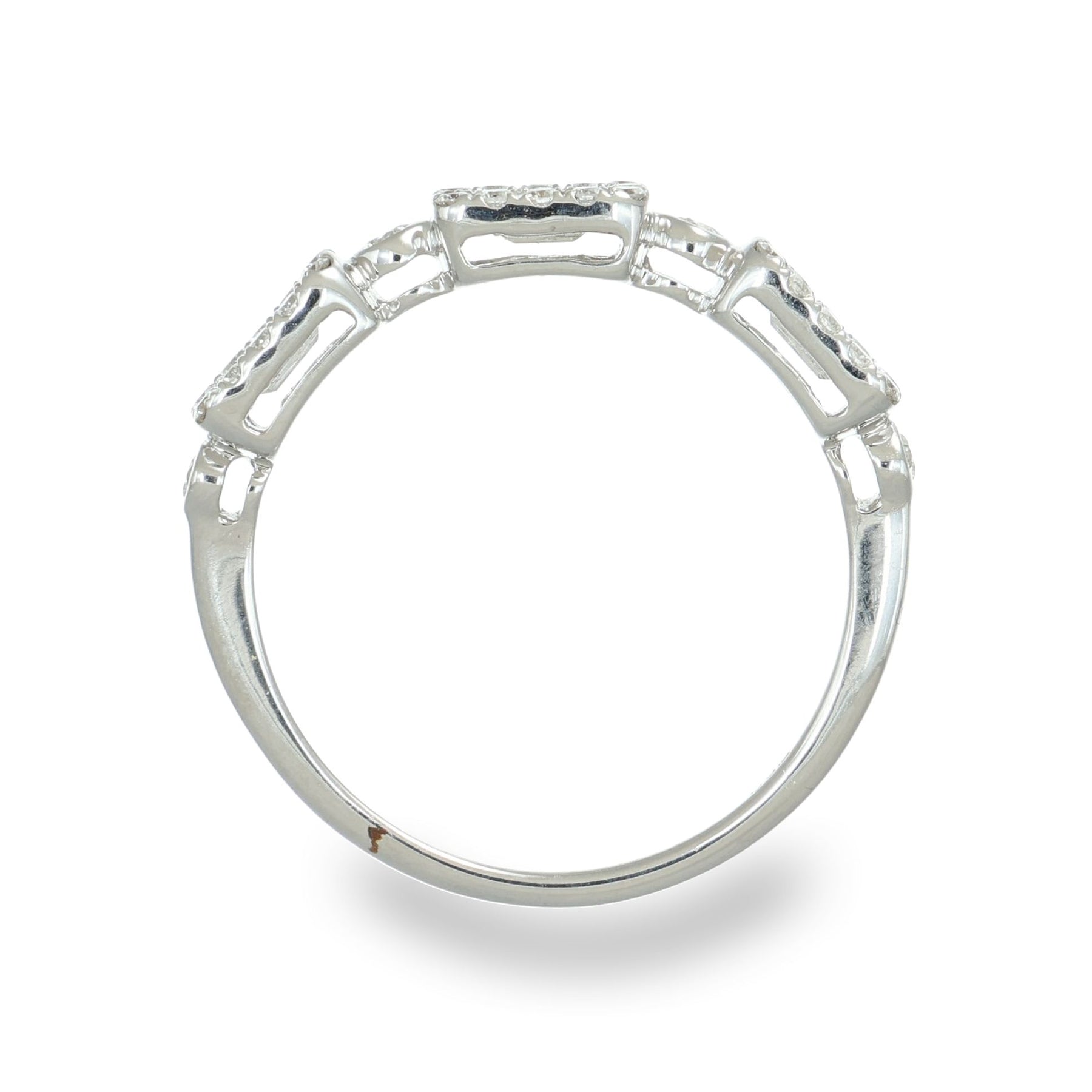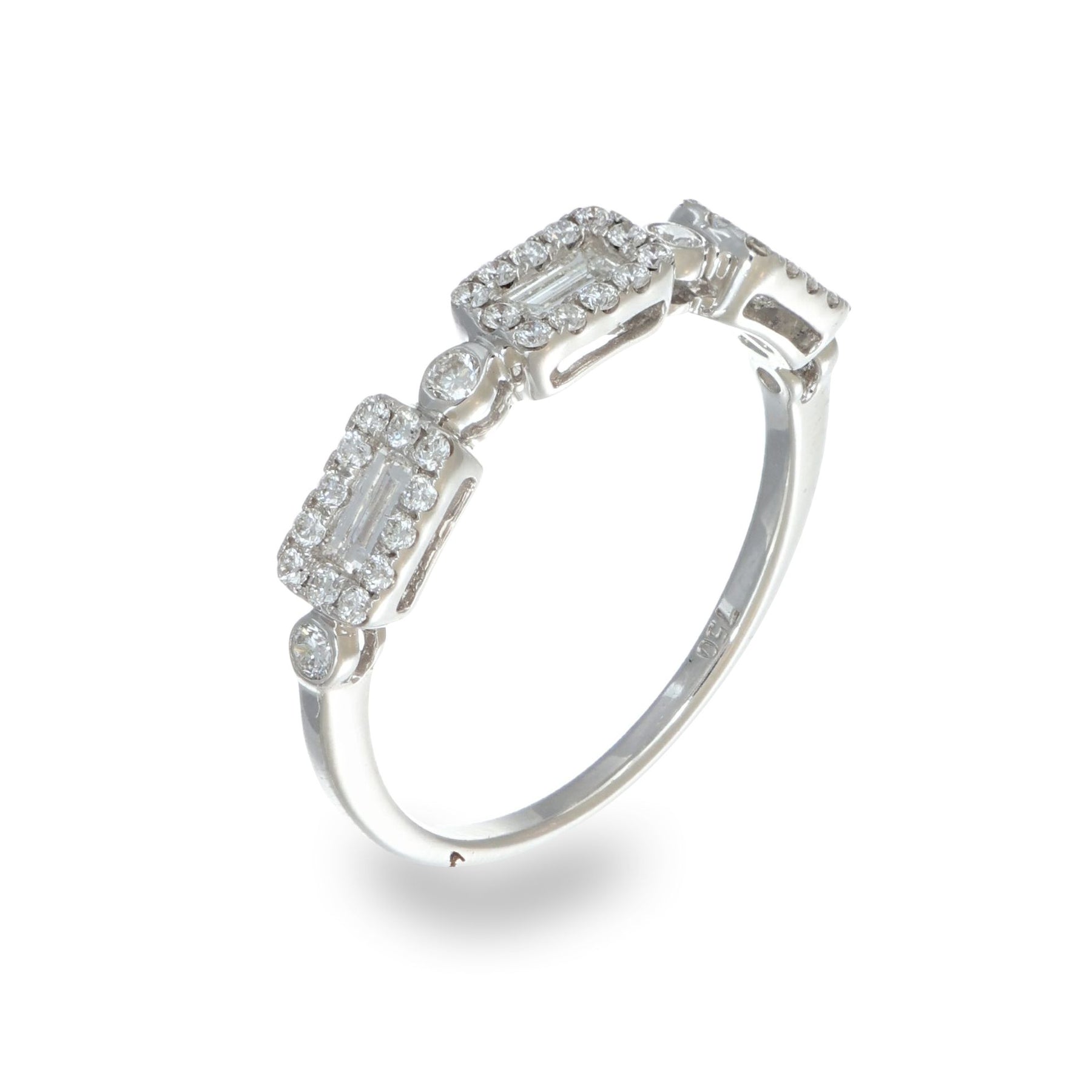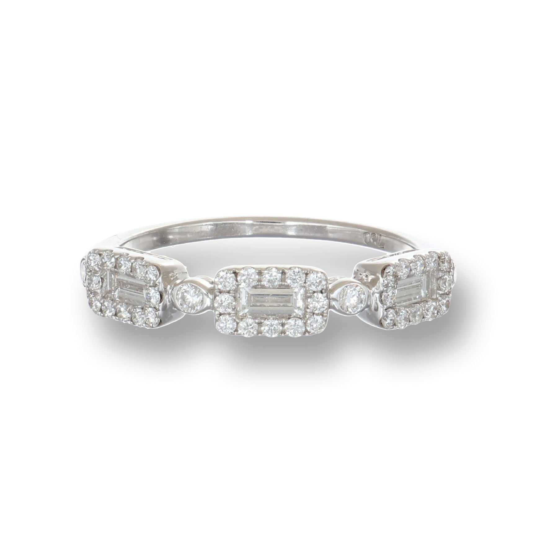 Dieser feine Ring aus 750/- Weißgold überzeugt durch seine architektonische Raffinesse und feminine Ausstrahlung. Drei rechteckige Baguette-Diamanten bilden das stilisierte Zentrum, umrahmt von funkelnden Brillanten, die jede Bewegung mit Licht durchfluten.