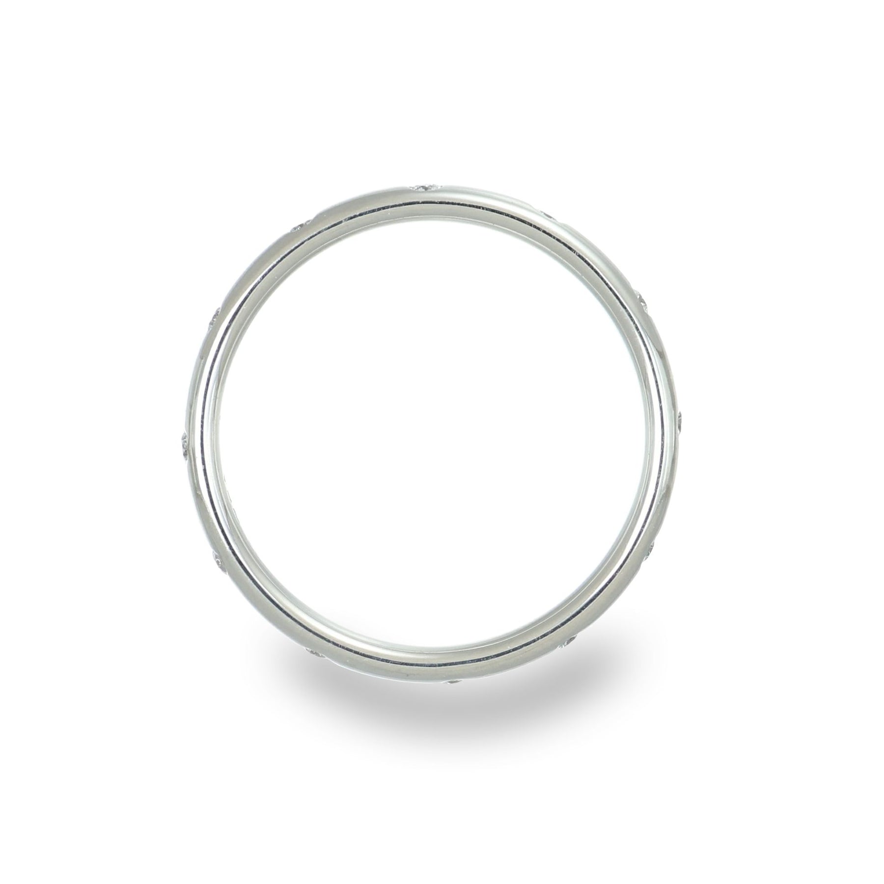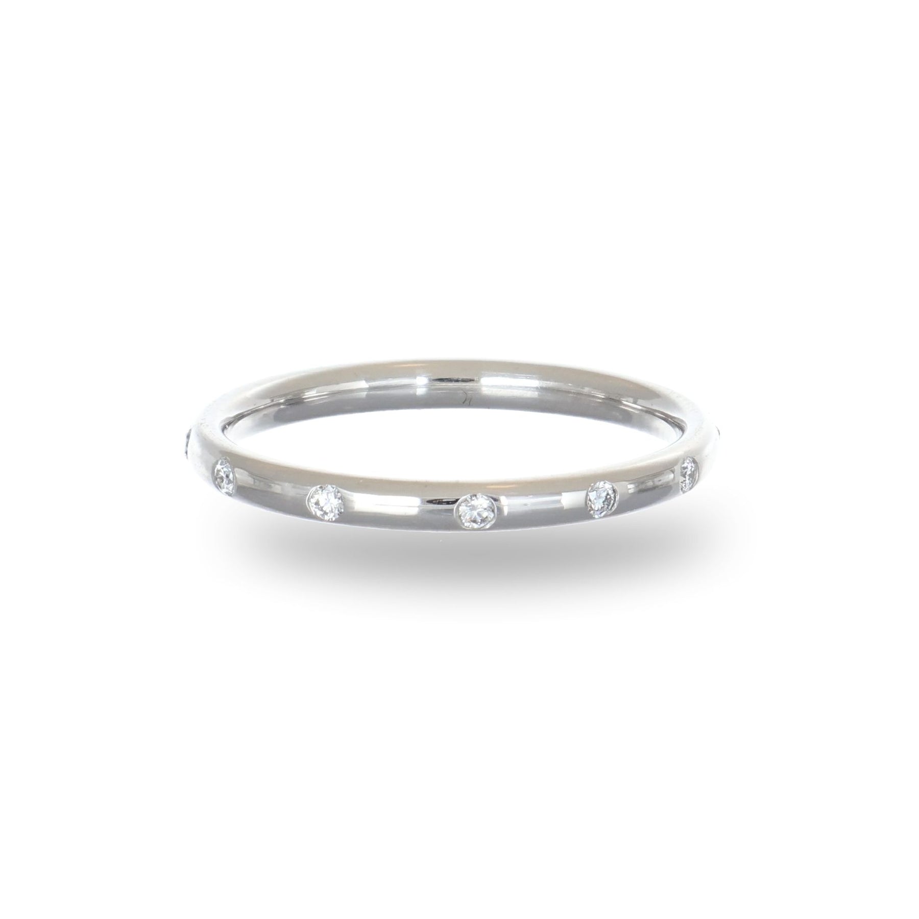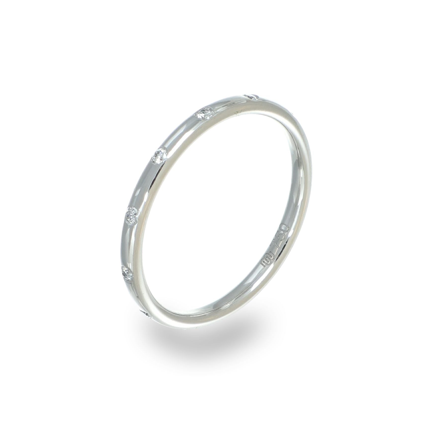 Fein, feminin und voller Zurückhaltung: Dieser Ring aus 750/- Weißgold überzeugt durch seine schlichte Eleganz und filigrane Verarbeitung. Zwölf funkelnde Brillanten sind rhythmisch über die zarte Ringschiene verteilt – wie ein leiser Hauch von Licht.