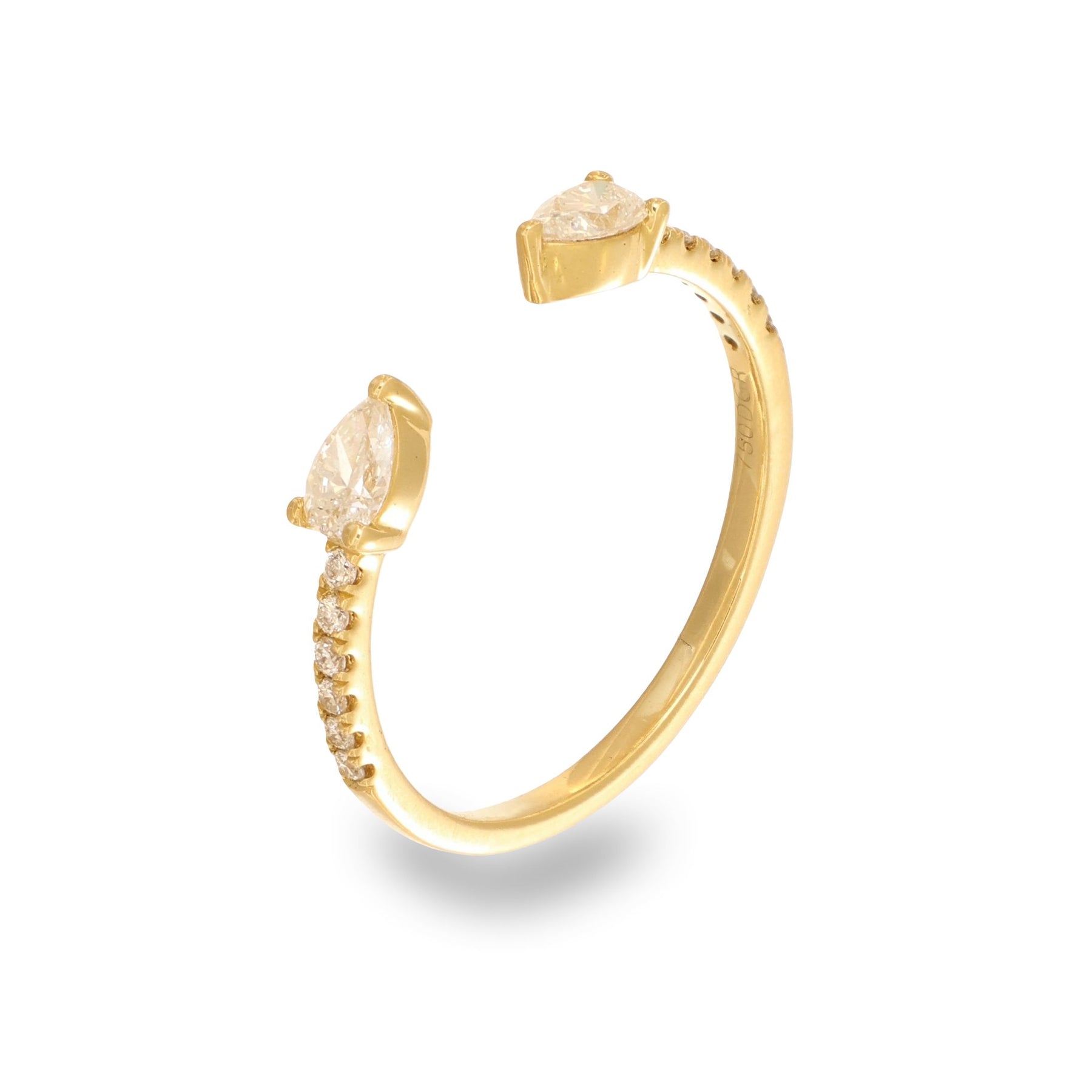 Zart geöffnet, vollendet im Ausdruck: Dieser raffinierte Ring aus 750/- Gelbgold kombiniert moderne Formensprache mit luxuriösem Funkeln. Zwei Tropfenschliff-Diamanten bilden die strahlenden Endpunkte des offenen Designs, während 12 fein gesetzte Brillanten die Ringschiene mit subtiler Eleganz betonen.