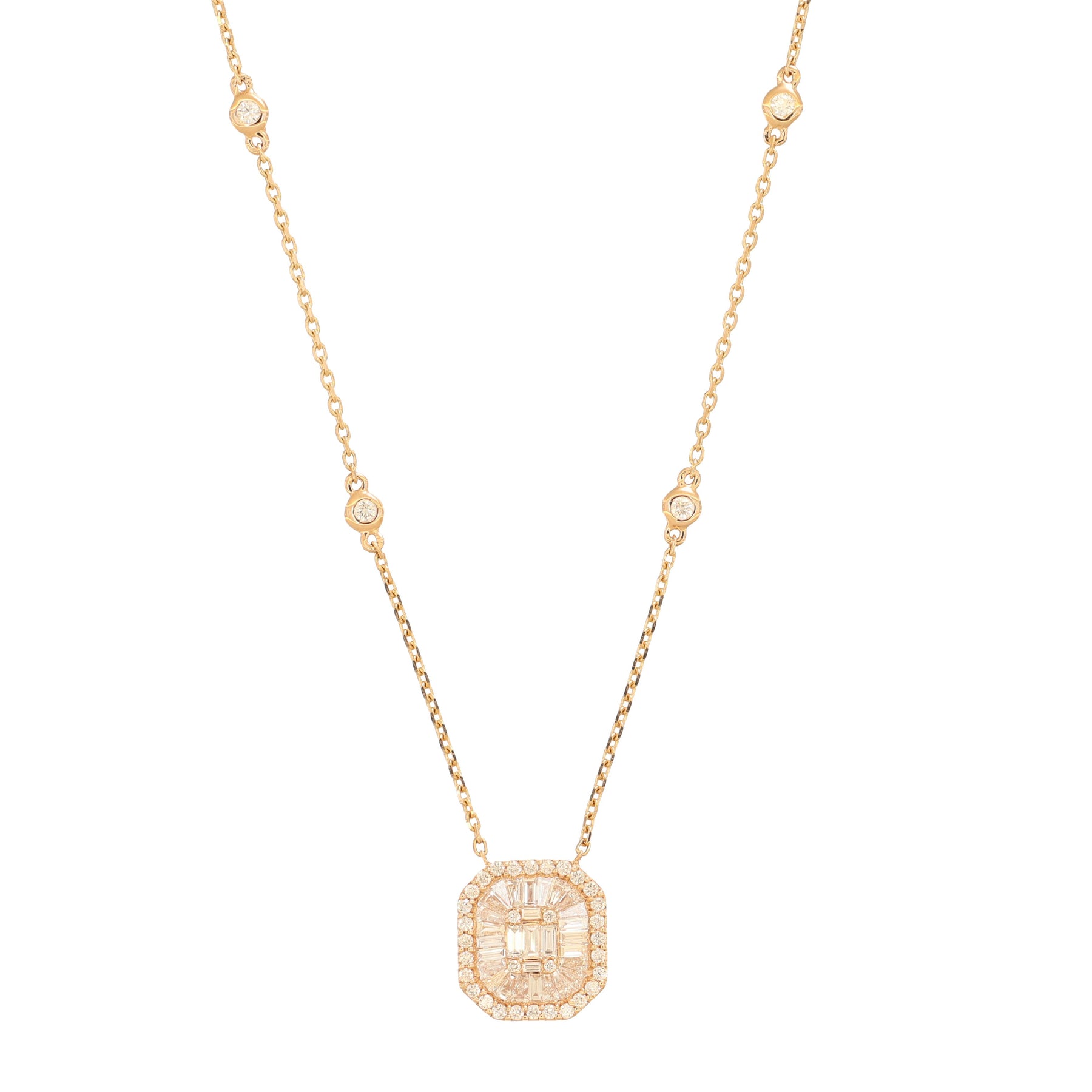 Diese Collierkette aus 750/- Roségold ist ein Statement von modernem Glamour und zeitloser Raffinesse. Im Zentrum steht ein achteckiger Anhänger, kunstvoll besetzt mit Baguette-Diamanten, die symmetrisch angeordnet ein architektonisches Spiel aus Licht und Tiefe erzeugen. Die äußere Umrandung aus fein gefassten Brillanten verstärkt den luxuriösen Glanz und sorgt für ein funkelndes Finish.